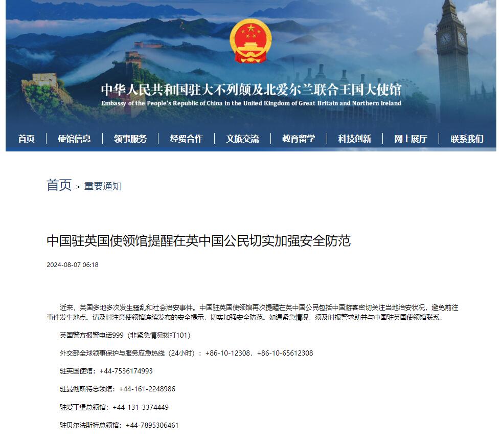 據中國駐英國使館網站,8月7日,中國駐英國使領館提醒在英中國公民切實加強安全防範: