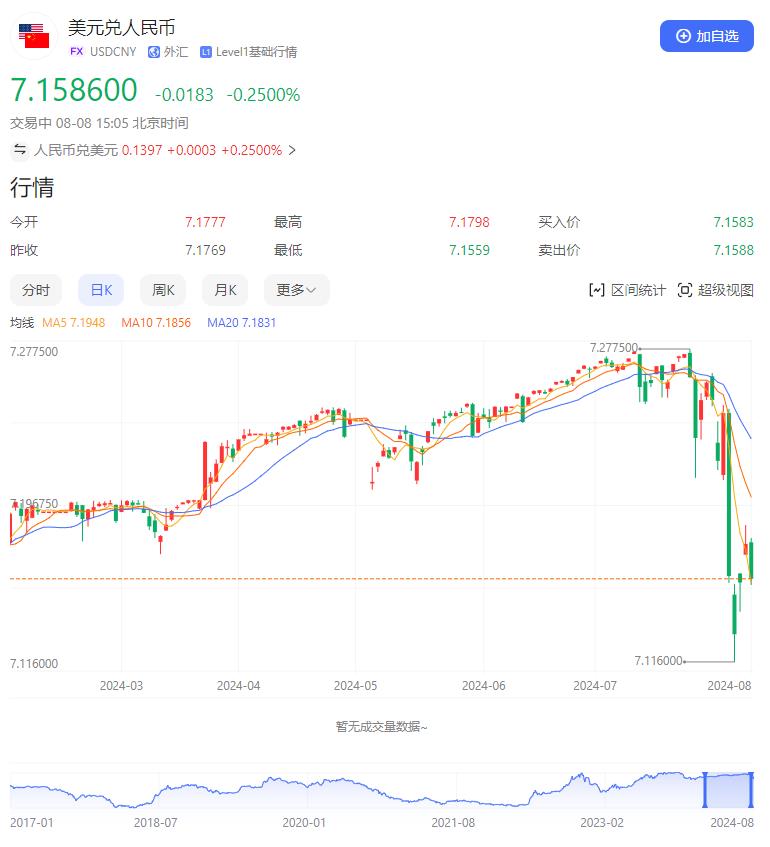 在日元套利交易逆轉等短期因素的推動下,8月2日至8月5日離、在岸人民幣匯率出現了爆發式升值,累計漲幅均超過1000個基點,一度逼近7.10。但隨着全球金融市場漸歸理性,8月6日起,離、在岸人民幣匯率又出現了回落。與此同時,銀行間外匯市場人民幣/美元匯率中間價也一直徘徊在7.13附近,並未出現明顯的升值。因此,相對於美聯儲降息預期,日元套利交易逆轉因素並非是人民幣升值的真正誘因。