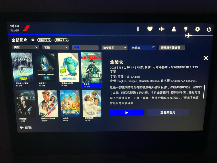 於是我勉強睡了四個小時後決定還是用觀看電影的方式來消磨剩下的時間。然而當我打開機上的片庫發現雷導的《拿破崙》赫然在列(它還提供了中文字幕版)時,着實繃不住發出了一聲爆笑。