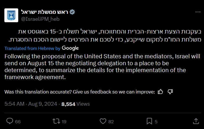 中東局勢因伊朗的潛在報復襲擊升高之際,美國、卡塔爾和埃及試圖推動以色列和巴勒斯坦伊斯蘭抵抗運動(哈馬斯)儘快重返談判。對此,以色列總理辦公室9日凌晨發表聲明説,以色列同意本月15日恢復加沙地帶停火和釋放被扣押人員談判,哈馬斯則尚未回應。