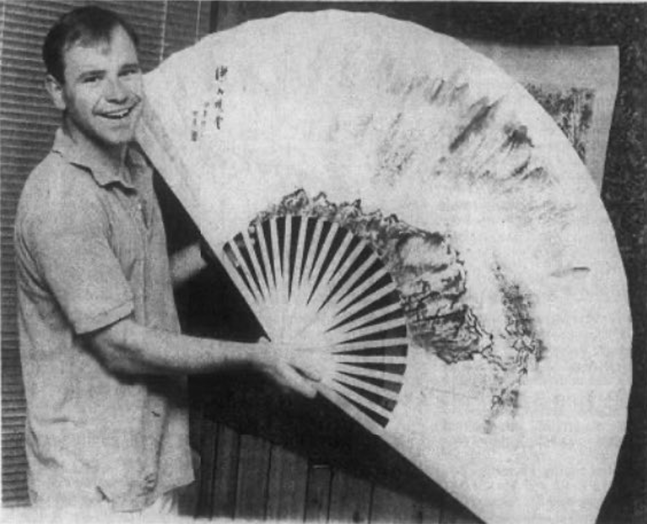 1990年,沃爾茲展示中國朋友贈送的扇子Northwest Nebraska報道截圖