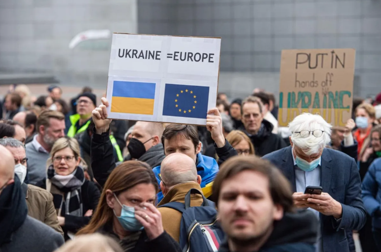 針對俄烏戰爭的全體會議在布魯塞爾歐盟總部舉行後,示威者在歐洲議會前進行抗議。《亞洲時報》