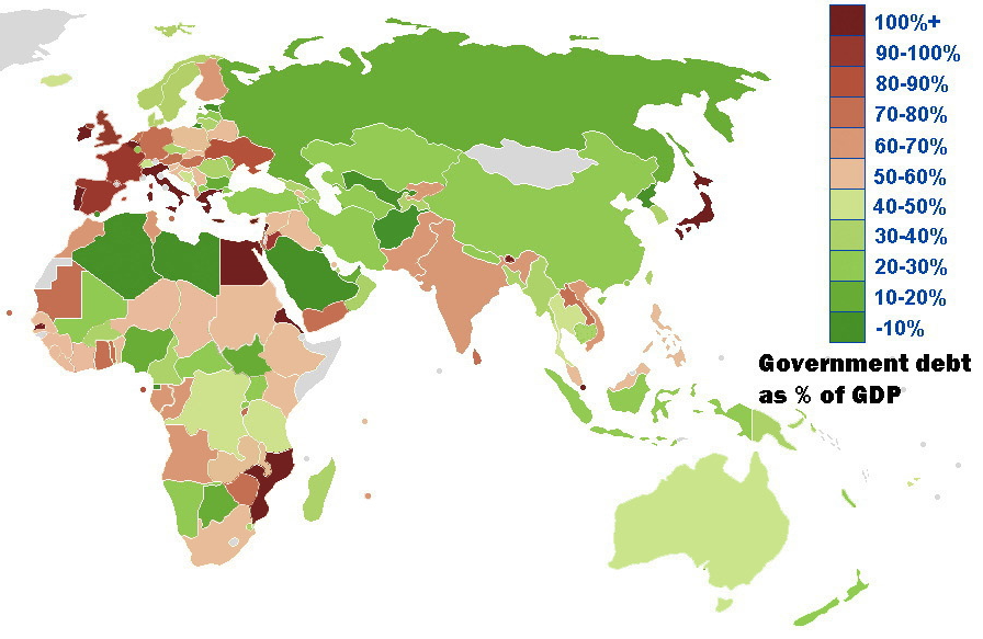 國際貨幣基金組織(IMF)於2012年發佈的各國政府債務佔國內生產總值(GDP)比例的數據,歐洲債務嚴重。維基百科