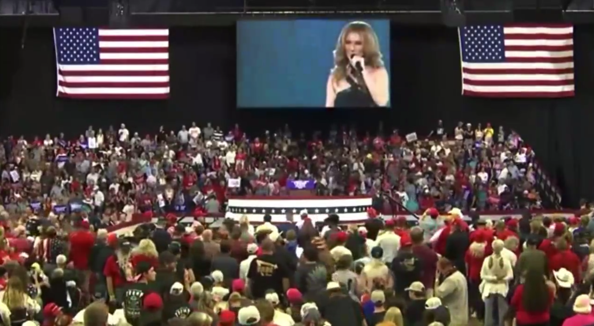 據報道,當地時間9日,特朗普蒙大拿州的競選集會上,舞台附近的大屏幕播放了席琳·迪翁演唱的《我心永恆》和相關視頻片段。
