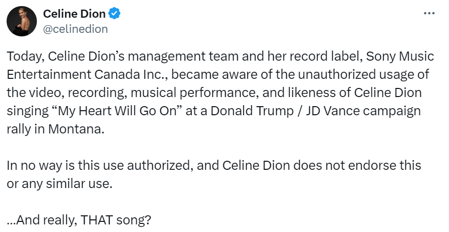 席琳·迪翁11日在X網站發文稱,席琳·迪翁的管理團隊及唱片公司索尼音樂注意到,在蒙大拿州舉行的特朗普和萬斯的競選集會上,席琳·迪翁演唱的《我心永恆》的視頻、錄音、音樂表演和肖像被未經授權使用。