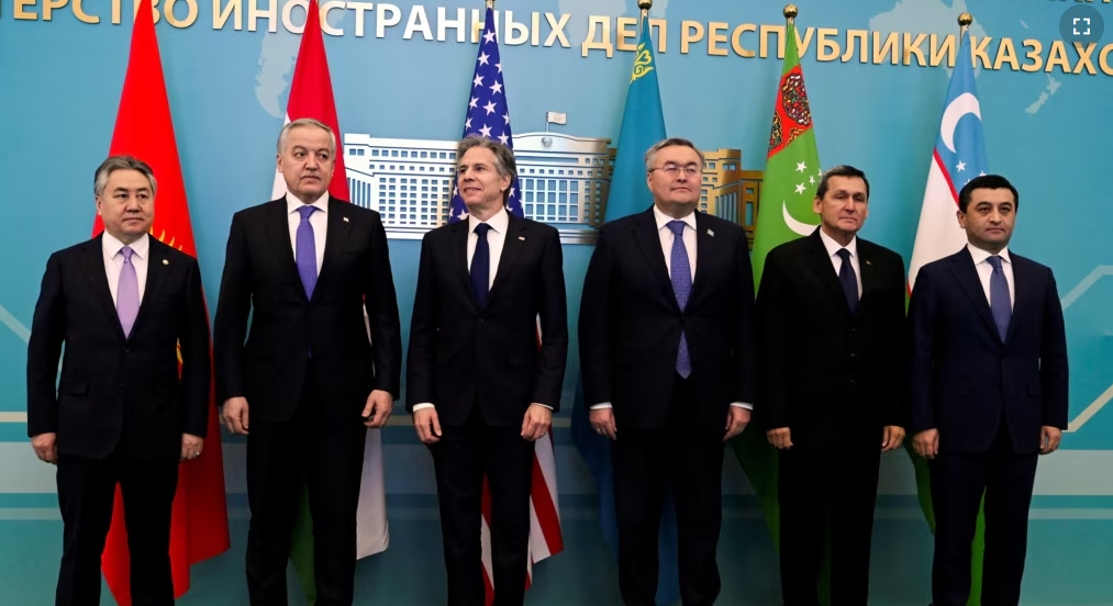 2023年2月28日,美國國務卿布林肯在哈薩克斯坦首都阿斯塔納與參加美國-中亞(C5+1)部長級會議的中亞各國外長合影。路透社