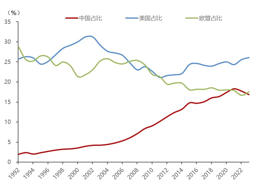 上圖發現,真正衰退的是歐盟,過去31年GDP佔全球份額下降了11個百分點,而美國則在2011年以後其GDP全球份額重新開始回升,迄今已經上升了近5個百分點。中國恰好是在2011年起步入經濟增速的下行階段,儘管其佔全球份額仍在上升。