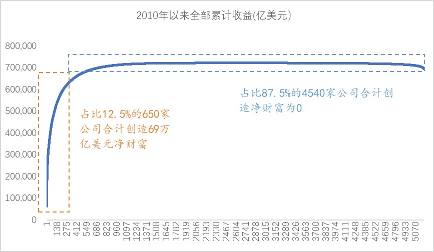 2010年至今美股佔比12.5%的650家公司合計創造69萬億美元淨財富(股價上漲的價差收益加上分紅),佔比87.5%的4540家公司合計創造淨財富為0。