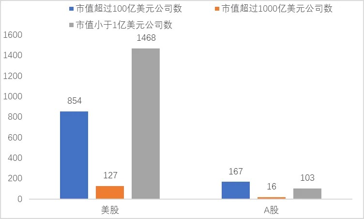 但美股低於1億美元市值的公司1468家,A股只有103家。我們是否可以粗略得出以下結論,美股的好公司相對較多,差公司也不少。A股則是好公司少,差公司儘管不少,但估值水平明顯偏高。