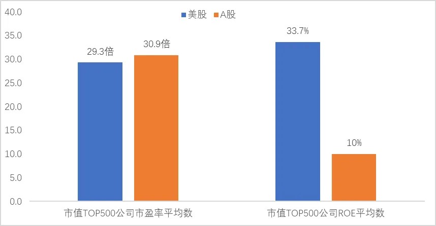如果把中美上市公司按市值大小排序的前500家進行比較,發現我國市值前500家(約前10%)的上市公司市盈率平均值30.9倍,中位數18.7倍;美股市值前500家公司市盈率平均數29.3,中位數23.4。儘管平均市盈率幾乎一樣,但平均淨資產收益率卻大相徑庭。從2024年一季報看我國市值前500家上市公司ROE平均數為10%,中位數為9.6%;美股市值前500家公司的ROE平均數33.7%,中位數為14.7%。