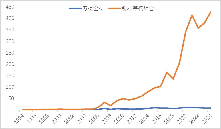 與美股相比,A股的分化程度不如美股那麼極端。如過去30年,漲幅前20的股票大幅跑贏萬得全A指數:從1994年至2024年7月,漲幅最大前20的股票等權組合累計復權收益達到425倍以上,而期間萬得全A指數漲幅只有7倍左右。