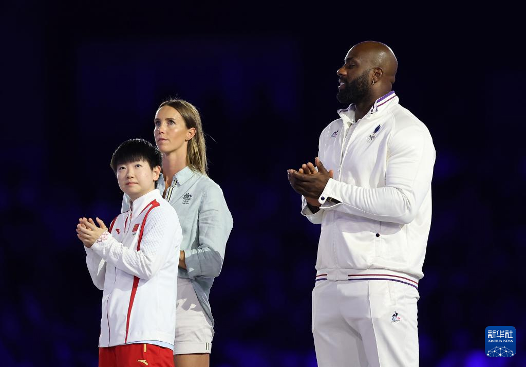 8月11日,中國乒乓球運動員孫穎莎(左一)在閉幕式的國際奧委會主席和巴黎奧組委主席致辭環節上。新華社