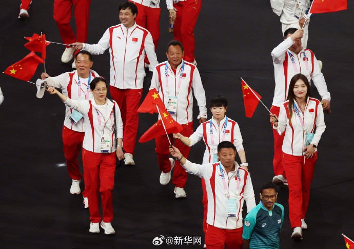李發彬和歐紫霞擔任旗手,中國代表團手持五星紅旗入場。@新華網