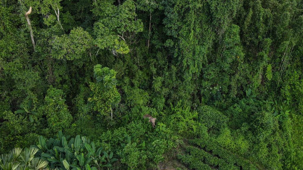 在雲南西雙版納國家級自然保護區勐養片區邊緣活動的亞洲象阿寶(7月26日無人機照片)。(許團明 攝)