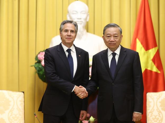 7月27日,越南國家主席蘇林在主席辦公廳代表越南黨和國家領導人會見了赴越南弔唁阮富仲總書記逝世的美國國務卿安東尼·布林肯。VGP