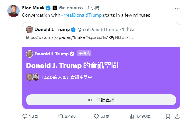 美東時間12日晚8時42分,訪談正式開始。據“X”實時統計,兩人對話開始時,已有超過 100 萬人在收聽。