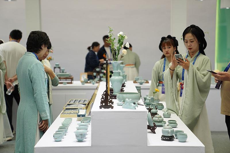 △2023年10月18日,人們在2023中國景德鎮國際陶瓷博覽會汝窯展台參觀。