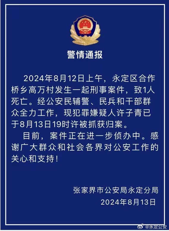 2024年8月12日上午,永定區合作橋鄉高萬村發生一起刑事案件,致1人死亡。經公安民輔警、民兵和幹部羣眾全力工作,現犯罪嫌疑人許子青已於8月13日19時許被抓獲歸案。