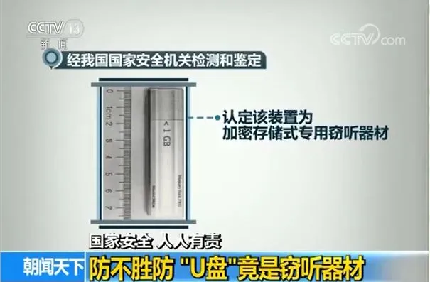該設備被送回國內後,經國家安全機關檢測鑑定,認定該裝置為境外間諜情報機關使用的專用間諜器材,外觀偽裝為普通U盤,內置兩個微型麥克風,由內設的3.7V鋰電池供電,用隱藏式微型按鈕實現工作狀態控制,具有數字加密錄音功能。