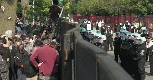 路透社的一名目擊者稱,在經過幾個小時的和平示威後,數十名抗議者衝破了部分外圍的安全圍欄,將防暴警察吸引到現場。民主黨全國委員會安全小組表示,執法人員行動迅速,這一事件沒有造成安全威脅。目擊者看到4人被拷上手銬並拘留。芝加哥警方在新聞發佈會上證實了這一點,他們逮捕了一些人,但沒有具體説有多少人。