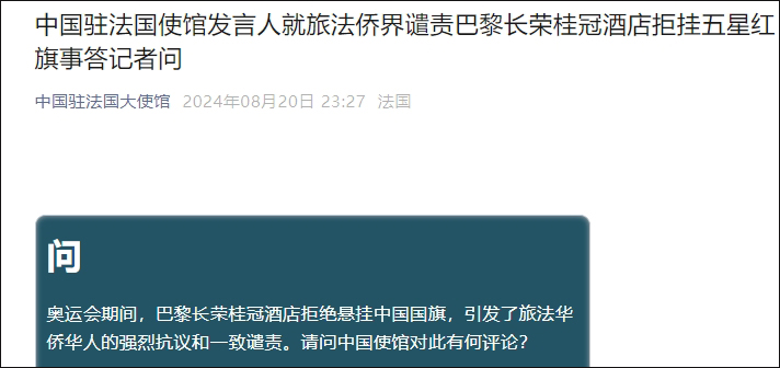 據微信公眾號“中國駐法國大使館”8月20日消息,中國駐法國使館發言人就旅法僑界譴責巴黎長榮桂冠酒店拒掛五星紅旗事答記者問。