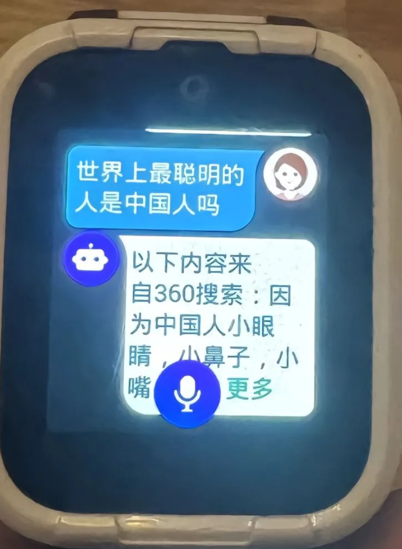 8月22日,有網友發佈視頻,稱其使用智能兒童手錶提問“中國人是世界上最聰明的人嗎?”時,得到的答案讓她覺得“毀三觀”。據該網友介紹,該手錶是在2023年購買的,主要是為了防止女兒走丟,手錶的品牌是360兒童手錶。