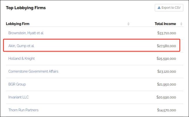 心智觀察所查閲美國非營利團體OpenSecrets發佈的基於“外國遊説觀察”(FLW)收集司法部(DOJ)外國代理人註冊法網站上提供的所有文件,以及美國參議院公共記錄辦公室(OPR)負責維護的《遊説披露法》(LDA)、《政府道德法》等記錄、報告和其他文件,清楚地發現,Akin Gump絕非只是一家擅長打跨國公司“民訴官”類型的律所,該機構還承擔着繁重的遊説業務。