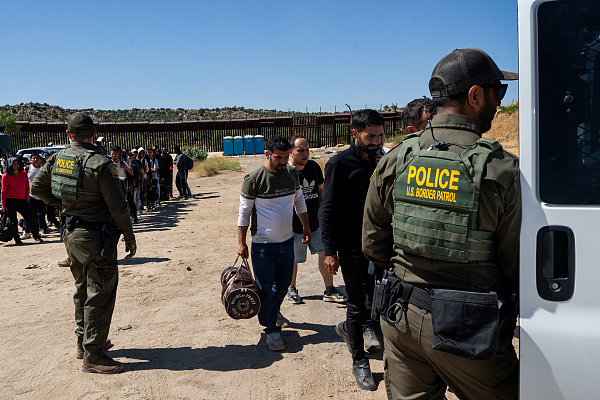 當地時間6月14日,美墨邊境,尋求庇護的移民接受美國邊境巡邏隊處理 視覺中國