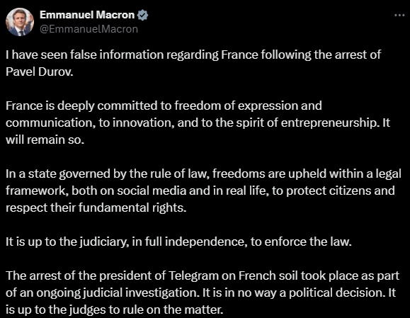 報道稱,馬克龍當地時間26日在社交平台X上發文稱,杜羅夫被捕後,自己看到了有關法國的虛假信息。馬克龍表示,法國“堅定致力於”言論自由,但“無論是在社交媒體還是在現實生活中,自由在法律框架內得到維護,以保護公民並尊重他們的基本權利。”