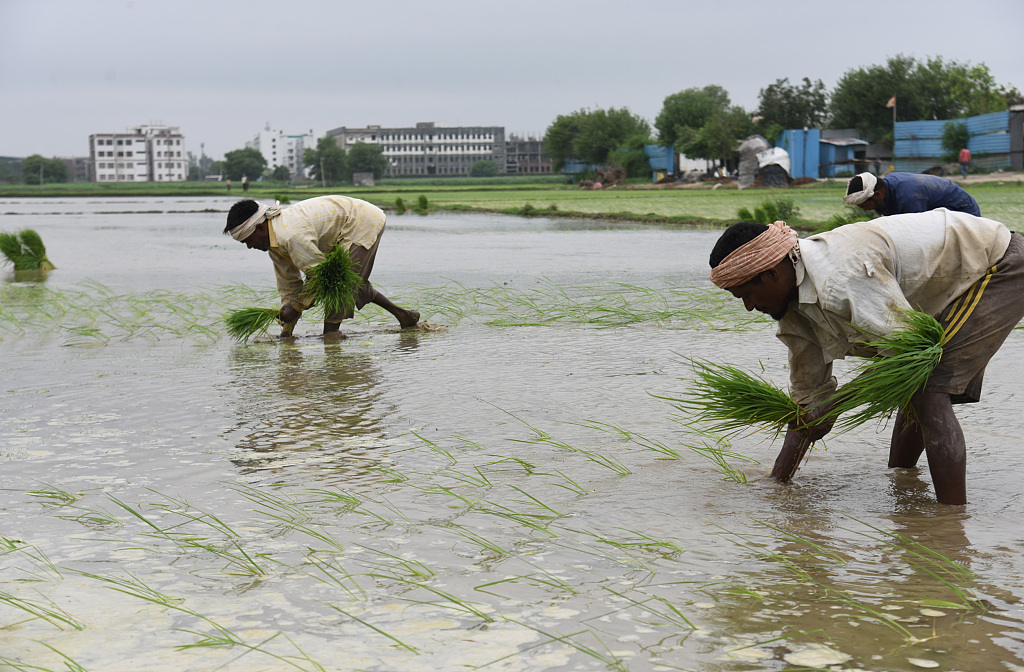 當地時間7月8日,印度加濟阿巴德,來自比哈爾邦的農民工在田地裏種植水稻幼苗 視覺中國