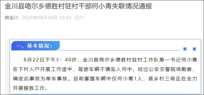 8月22日下午3:40許,金川縣咯爾鄉德勝村駐村工作隊第一書記何小青在下村入户開展工作途中,駕駛車輛不慎墜入河中。經過公安交警現場勘察,確定此事故為單車事故。目前掌握車輛中僅何小青1人,縣鄉村三級正在全力開展搜救工作。