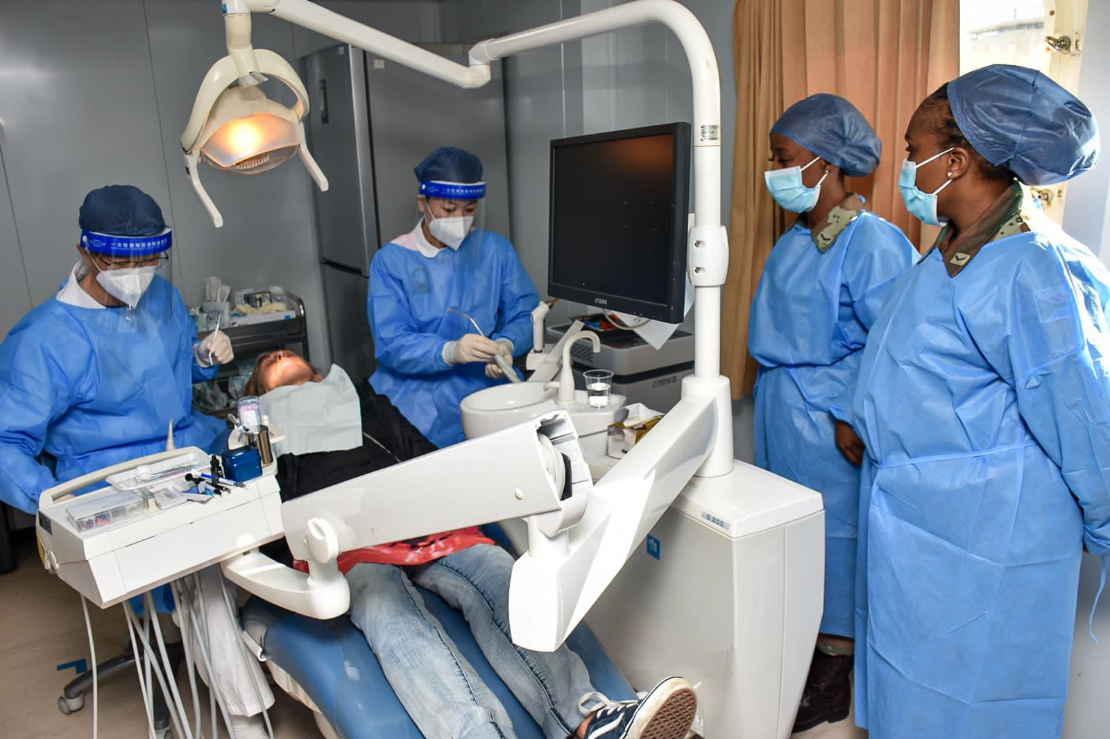 報道描述道,在一名中國醫院工作人員的指引下,病人們排起了長隊。在一間診療室裏,兩名患者在接受緩解疼痛的背部拔火罐治療;另一間診療室中,一名病人正在接受牙科治療。
