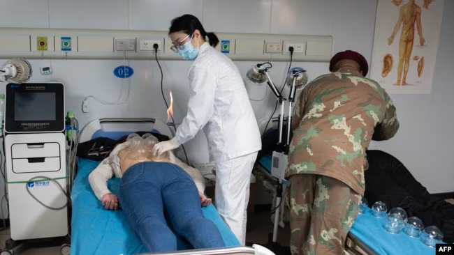 一名中國醫生和一名南非軍醫在“和平方舟”號醫院船上為患者拔火罐法新社
