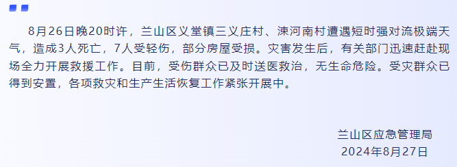 據山東臨沂蘭山區應急管理局“安全蘭山”微信公眾號消息,8月26日晚20時許,蘭山區義堂鎮三義莊村、涑河南村遭遇短時強對流極端天氣,造成3人死亡,7人受輕傷,部分房屋受損。災害發生後,有關部門迅速趕赴現場全力開展救援工作。目前,受傷羣眾已及時送醫救治,無生命危險。受災羣眾已得到安置,各項救災和生產生活恢復工作緊張開展中。