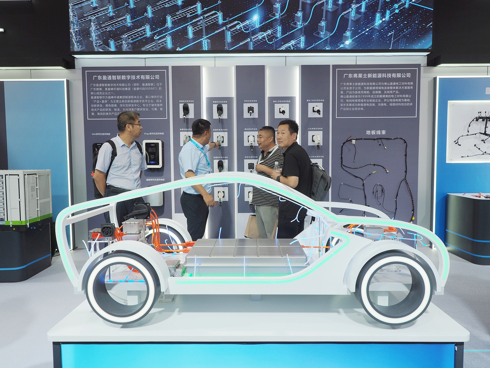 2024年8月14日,北京首鋼會展中心,觀眾在2024北京國際充電樁及換電站展覽會上參觀新能源汽車充電系統模型。視覺中國