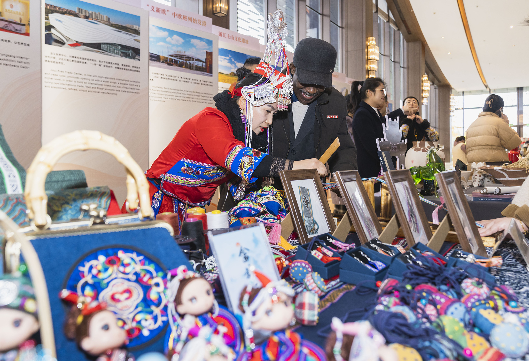 2023年12月20日,浙江金華,“一帶一路”金樞紐網絡國際傳播項目啓動,參會嘉賓在展位前瞭解浙江金華各縣市的展品。視覺中國