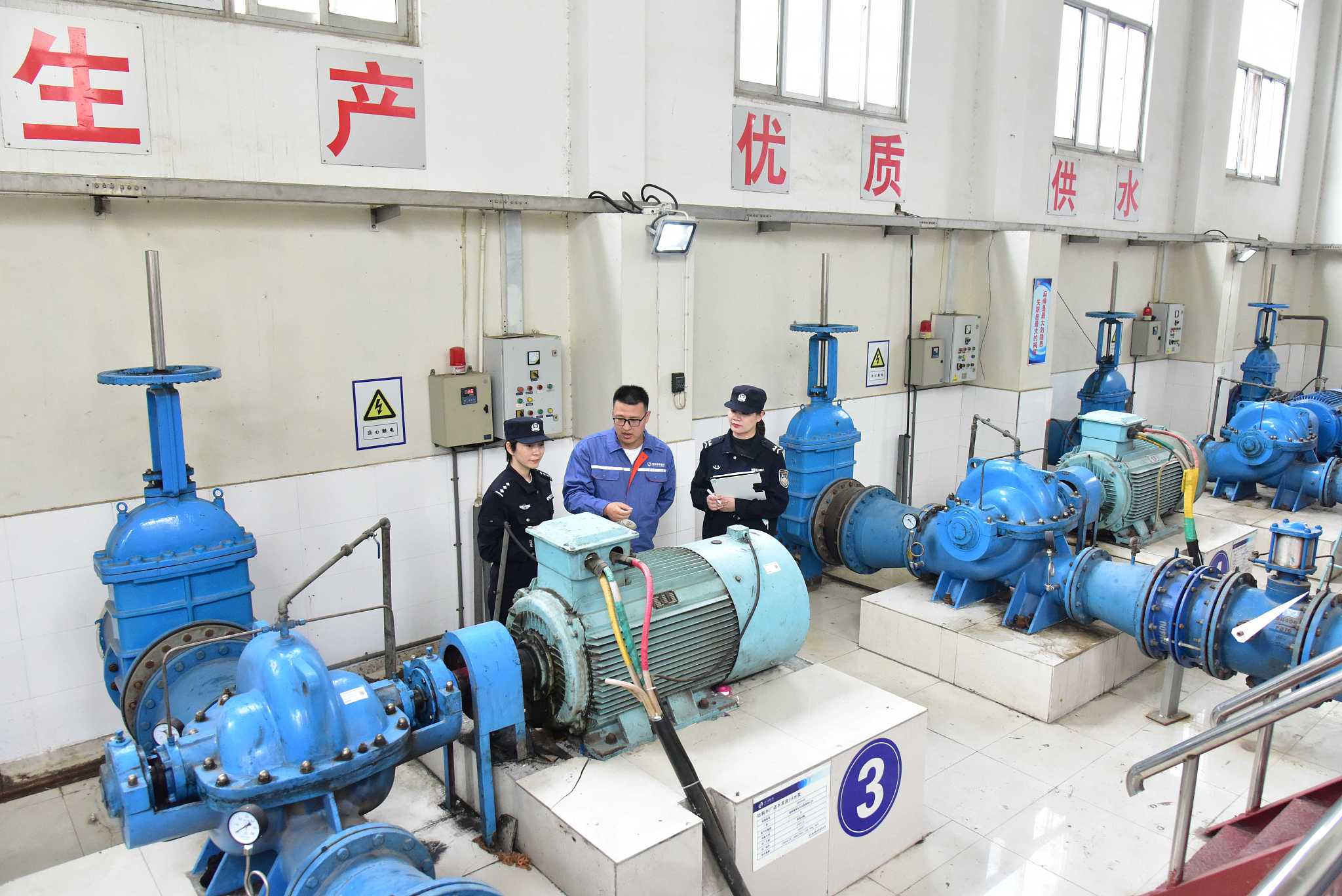 2024年4月23日,安徽馬鞍山,姑孰派出所民警在自來水廠向企業員工瞭解安全生產情況,以確保居民用水安全。視覺中國