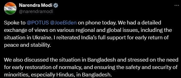 當地時間8月26日,莫迪與拜登通電話。莫迪在社交平台上公佈了通話內容:“我們就包括烏克蘭局勢在內的各種地區和全球議題詳細交換了意見。我重申印度全力支持早日恢復和平與穩定。”