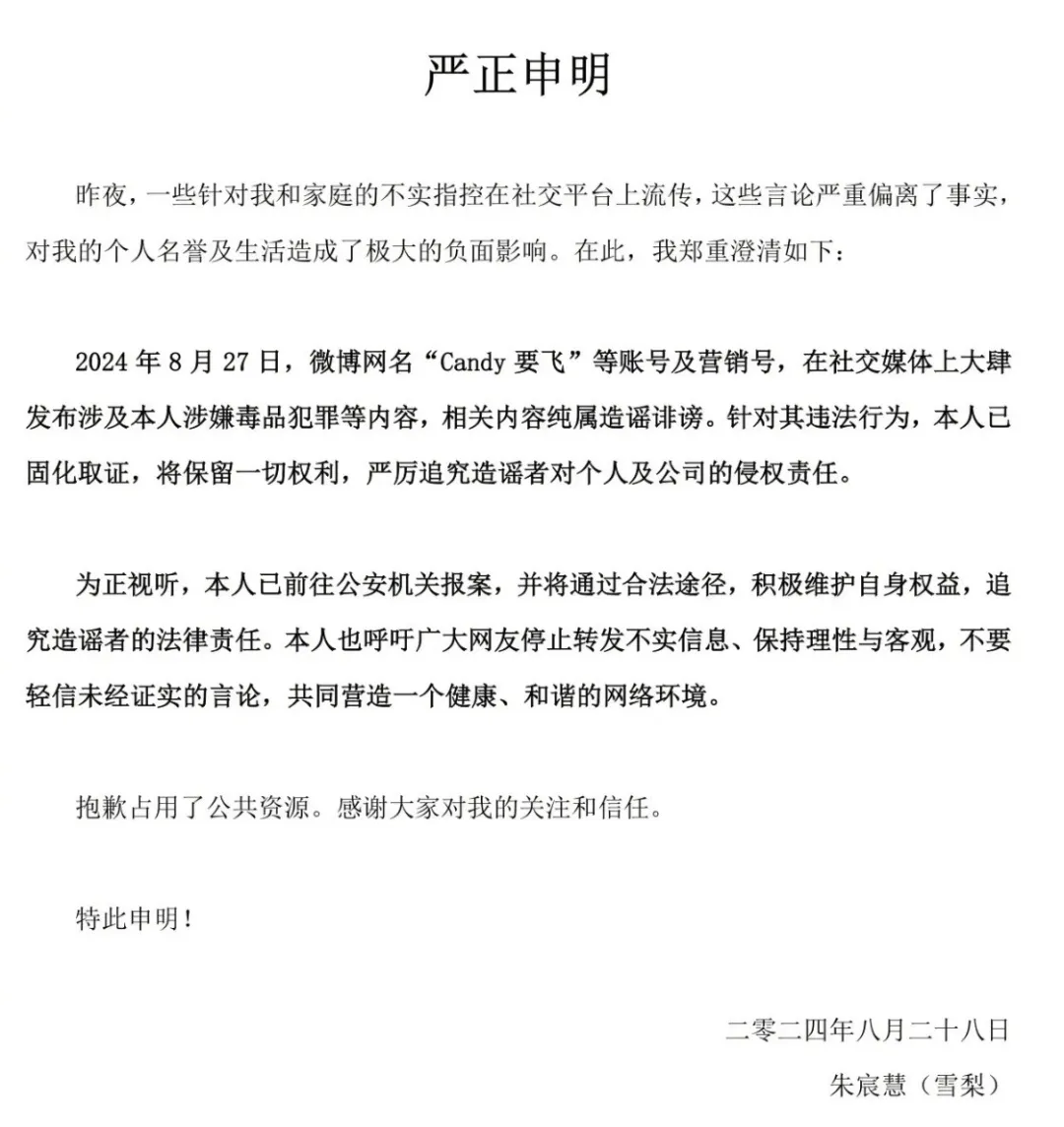 28日,雪梨發文回應:這些言論嚴重偏離了事實,對我的個人名譽及生活造成了極大的負面影響。本人已前往公安機關報案。