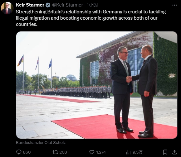 BBC稱,斯塔默在德國受到了熱烈歡迎,且與朔爾茨會談氣氛良好。兩國政府還承諾在短短六個月內談判一項涵蓋貿易、防禦、非法移民和其他諸多方面的條約。