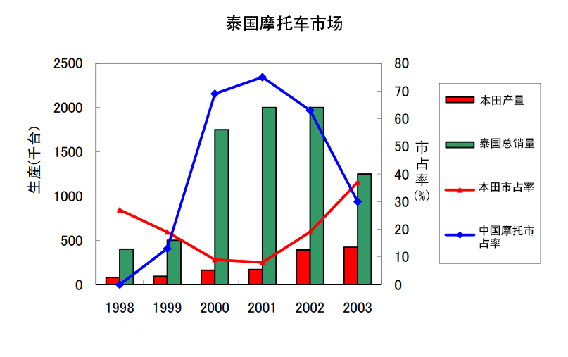 但在泰國建廠時,宗申卻遇到了一系列挑戰:泰國並非沒有合適的零部件供應商,但這些供應商大多服務於日本企業。泰國摩托車市場長期以來被本田、雅馬哈、鈴木等日系品牌所壟斷,日本摩托車佔據了97%的市場份額,其中本田一家就佔據了78%的銷量。