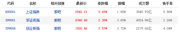 A股三大指數今日集體反彈,截止收盤,滬指漲0.68%,深證成指漲2.38%,創業板指漲2.53%。滬深兩市成交額超過8700億元,較昨日大幅放量超2600億,上漲股票數量超4600只。