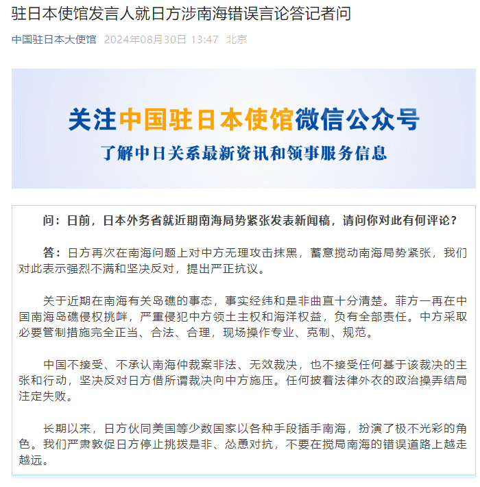 微信公眾號“中國駐日本大使館”8月30日消息,駐日本使館發言人就日方涉南海錯誤言論答記者問。