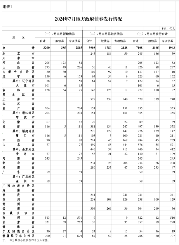 2024年7月,全國發行新增債券3200億元,其中一般債券385億元、專項債券2815億元。全國發行再融資債券3908億元,其中一般債券1780億元、專項債券2128億元。合計,全國發行地方政府債券7108億元,其中一般債券2165億元、專項債券4943億元。