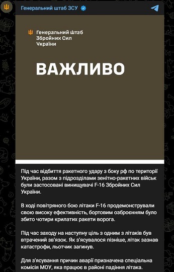 消息寫道,烏克蘭武裝部隊的F-16與防空導彈部隊配合,擊退了“俄羅斯對烏克蘭的導彈攻擊”(即俄羅斯自26日起對烏髮動的新一輪大規模空襲),在空戰中,F-16展現了高效作戰能力,依託機載武器“擊落了敵方4枚巡航導彈”。但在戰機飛向下一個攔截目標時,(指揮部)與其中一架飛機的通訊聯繫中斷。隨後證實飛機失事,飛行員喪生。為了查明事故原因,烏克蘭國防部已經委派了一個特別委員會,前往飛機失事地點展開調查。