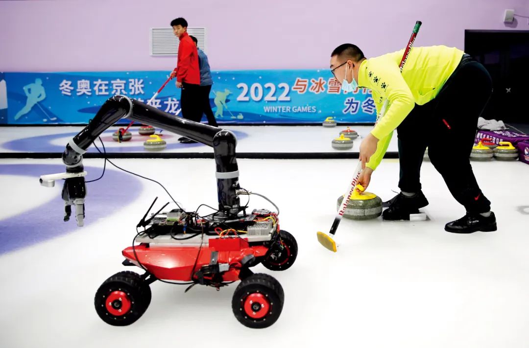 2022年科技創新迎冬奧冰壺人機對抗表演賽期間,由哈爾濱工業大學自主研發的智能冰壺機器人與專業冰壺運動員同場競技。攝影/本刊記者 姜輝