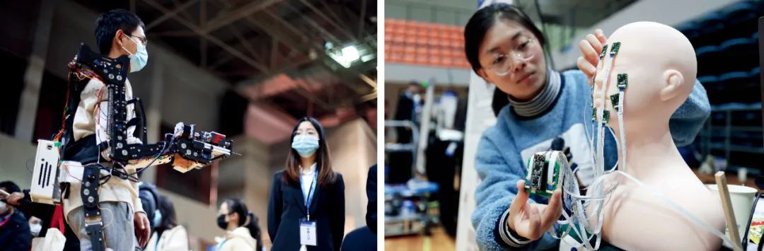 南京航空航天大學“天宮杯”研究生創新實驗競賽期間,參賽學生演示“無源助力外骨骼機器人”(左圖)、“基於可穿戴傳感器的面部肌肉康復訓練和評估系統”(右圖)。攝影/本刊記者 泱波