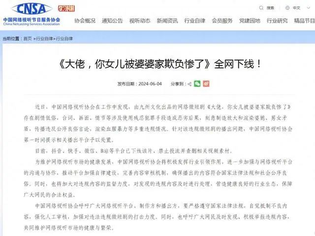 中國網絡視聽協會呼籲廣大網絡視聽平台、製作方和播出方,要嚴格遵守國家法律法規,自覺抵制不良內容,強化人工審核,加強對違法違規微短劇的打擊力度。同時,也呼籲廣大網民及時發現、積極舉報違規內容,共同維護網絡視聽市場的健康與繁榮。