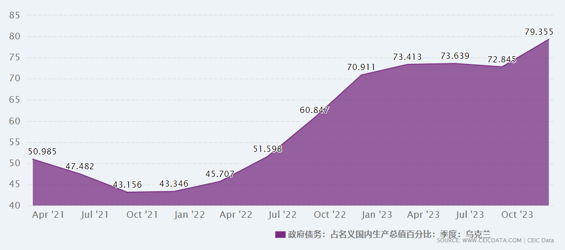 2010-12到2023-12期間的烏克蘭政府債務佔國內生產總值百分比