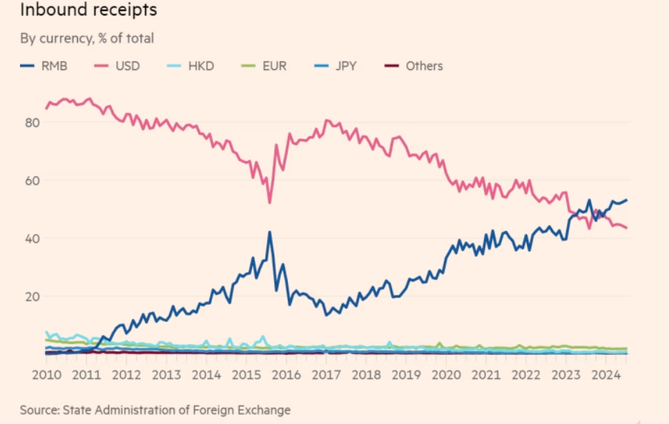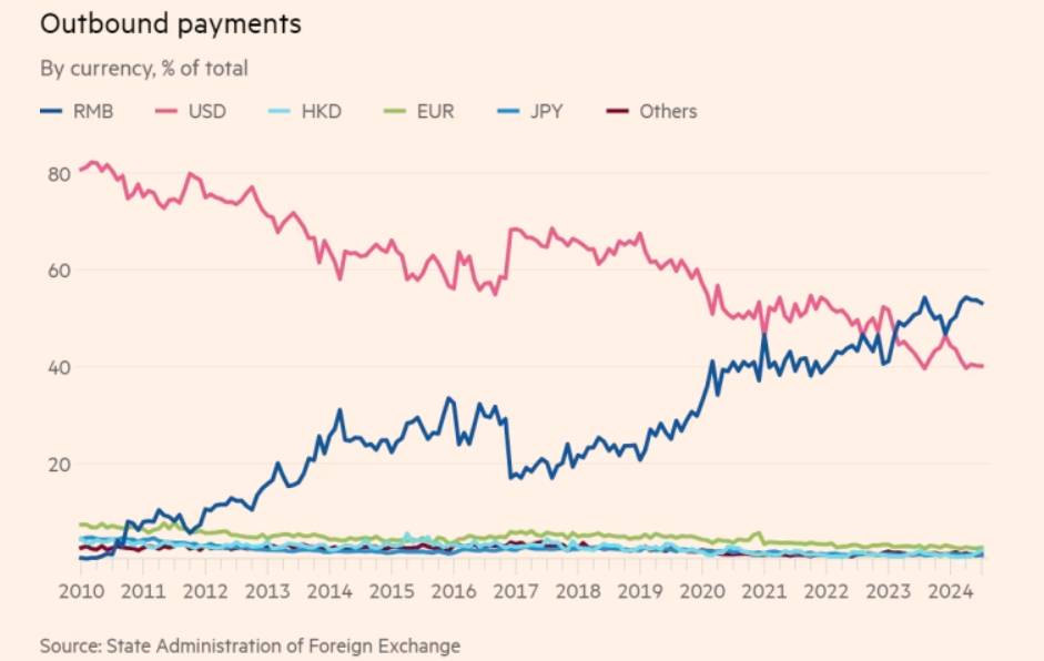 近年來,人民幣(藍色線)在中國境內外交易的使用佔比不斷上升《金融時報》製圖